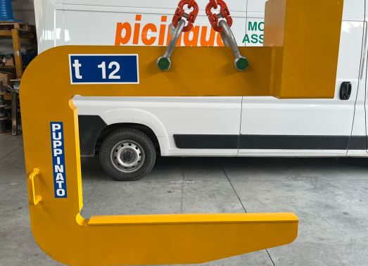 I ganci a “C” permettono all’addetto di sollevare e movimentare i coils e le bobine a distanza di sicurezza e senza alcun rischio.
